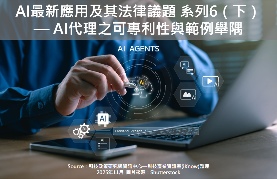 圖、AI最新應用及其法律議題 系列6(下)— AI代理之可專利性與範例舉隅 AI代理之專利申請範例舉隅 隨著代理型AI技術的發展,智慧財產保護變得極為重要。專利可涵蓋這些系統的不同面向,包...More