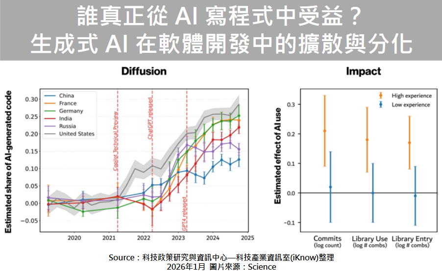 圖、誰真正從 AI 寫程式中受益?生成式 AI 在軟體開發中的擴散與分化 近年來,生成式人工智慧(Generative AI, GenAI)的快速發展,持續衝擊各行各業,其中對軟體開發工作...More