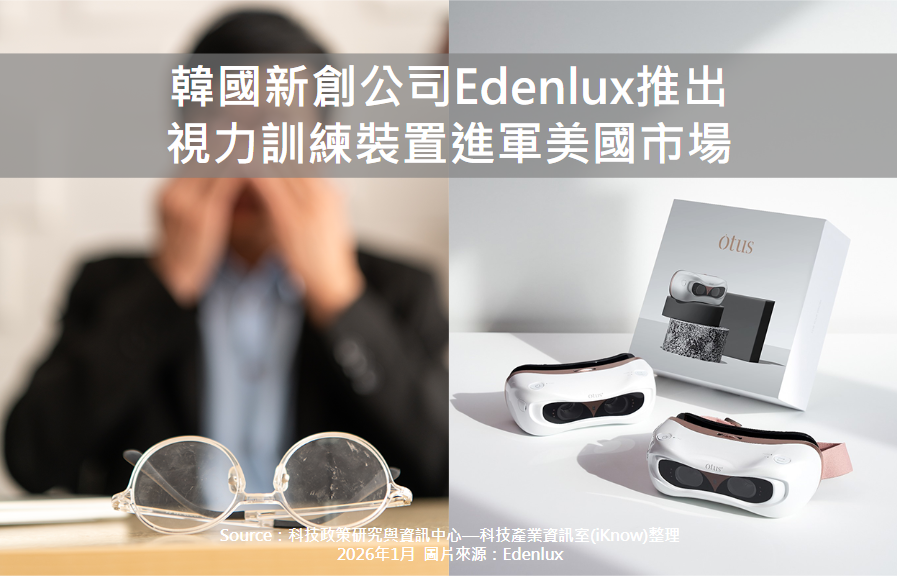 圖、韓國新創公司Edenlux推出視力訓練裝置進軍美國市場 現代人每日使用各類3C產品的時間持續攀升,長時間注視螢幕也使眼睛乾澀、視覺疲勞、頭痛與短暫視覺模糊等問題日益普遍,成為數位生...More