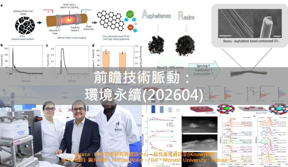 圖、前瞻技術脈動:環境永續(202604) 淨化方法去除水中的 PFAS,同時將廢物轉化為高價值的石墨烯 全氟和多氟烷基物質(PFAS)是一類人造有機氟化合物,被廣泛應用於不沾鍋、食品...More