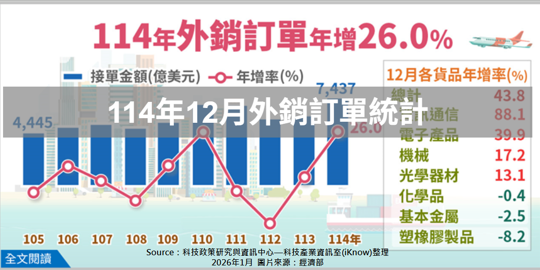 圖、114年12月外銷訂單統計 1.與上月比較:12月外銷訂單762.0億美元,較上月增加32.0億美元或增4.4%,經季節調整後增4.4%。 2.與上年同月比較:外銷訂單增加232.1億...More