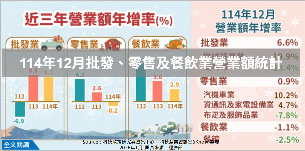 圖、114年12月批發、零售及餐飲業營業額統計 1. 批發業:114年12月批發業營業額為1兆2,514億元,年增6.6%,主因人工智慧及雲端運算等新興科技應用快速拓展,推升AI...More