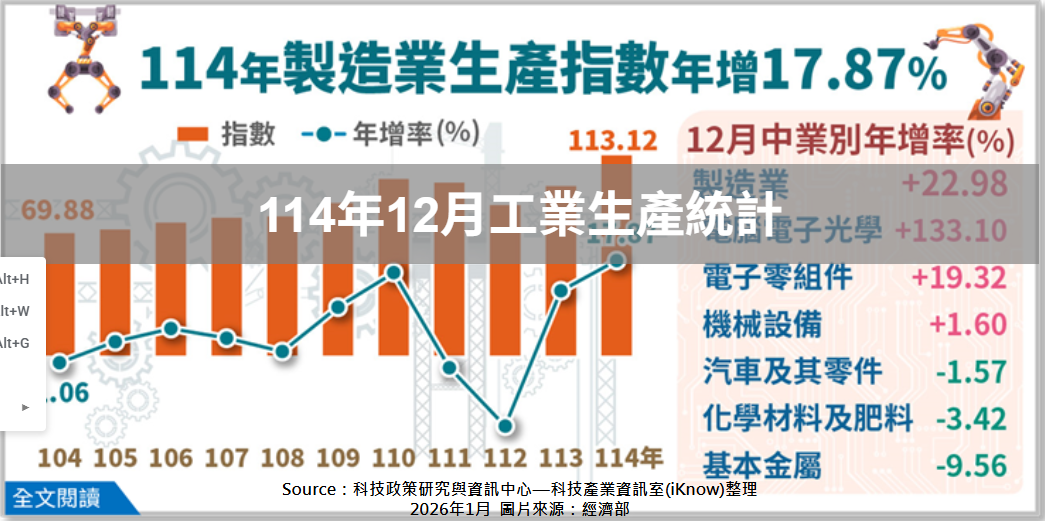 圖、114年12月工業生產統計 1.與上月比較:114年12月工業生產指數131.76,較上月增加11.01%,其中製造業增加11.44%;經季節調整後,工業生產增加5.80%,...More