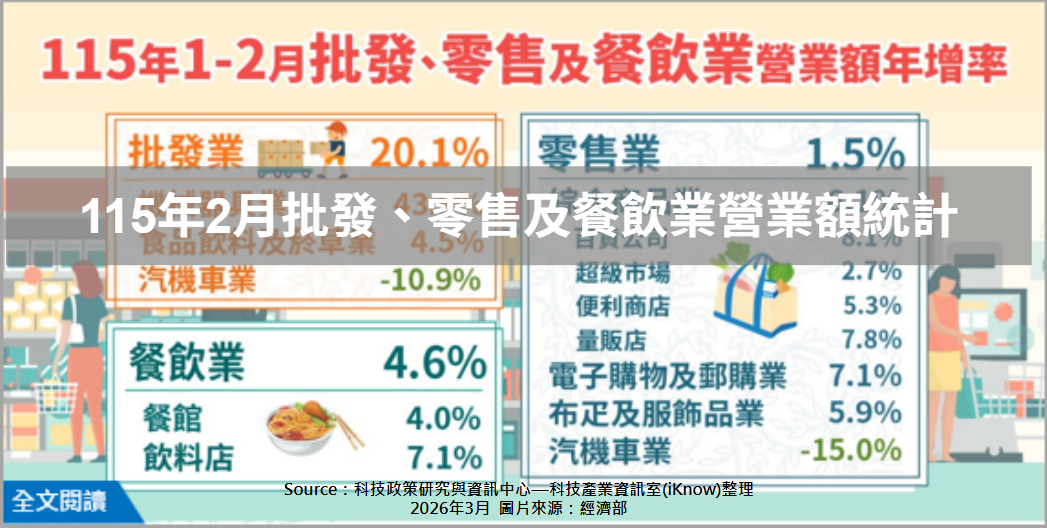 圖、115年2月批發、零售及餐飲業營業額統計 1. 批發業:2月批發業營業額為1兆1,191億元,年增6.8%,主因受惠新興科技應用蓬勃發展,惟受...More