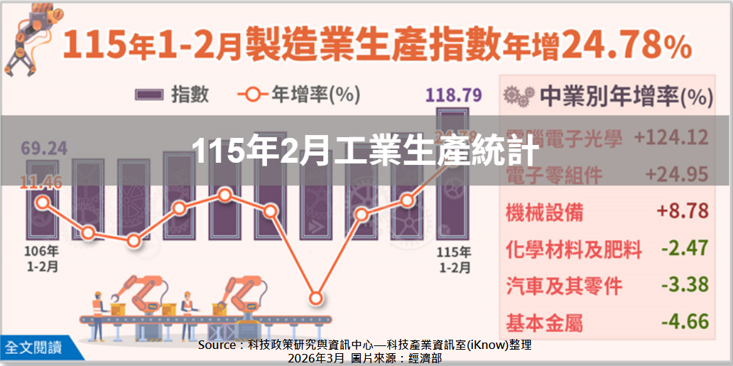 圖、115年2月工業生產統計 1.與上月比較:115年2月工業生產指數109.46,受到農曆春節影響,較上月減少11.65%,其中製造業減少11.48%;經季節...More