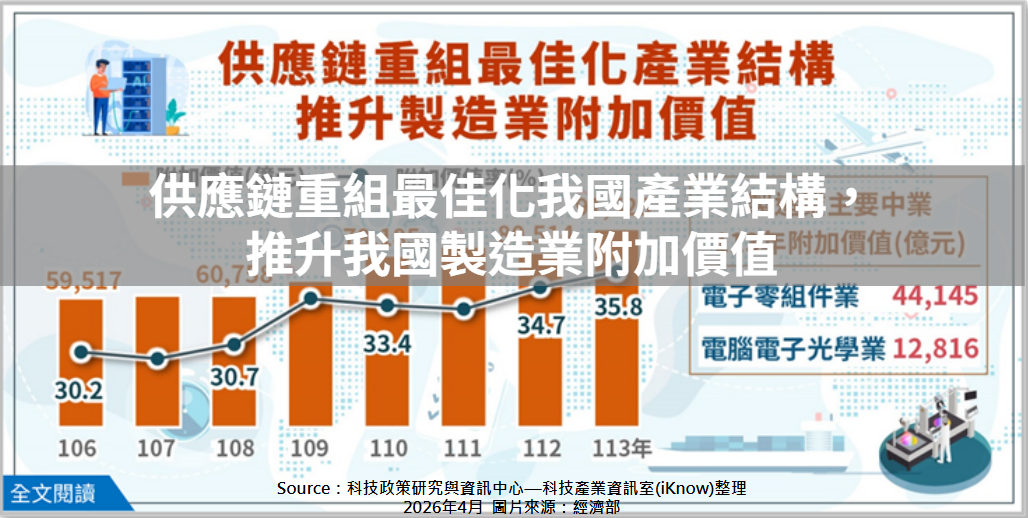 圖、供應鏈重組最佳化我國產業結構,推升我國製造業附加價值 1. 供應鏈重組拉升外銷訂單國內生產比,製造業產值突破21兆元:受美中貿易紛爭引發全球供應鏈重組,以及政府回...More