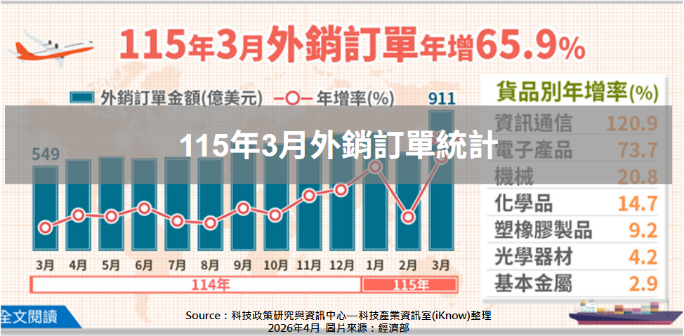 圖、115年3月外銷訂單統計 1.與上月比較:3月外銷訂單911.2億美元,較上月增加272.5億美元或增42.7%,經季節調整後增14.1%。 2.與上年同月比較:外銷訂單...More