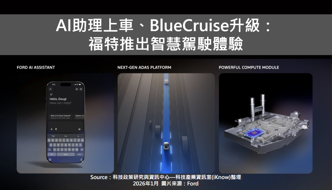 圖、AI助理上車、BlueCruise升級:福特推出智慧駕駛體驗 上週於拉斯維加斯舉行的2026消費性電子展(CES 2026)中,福特汽車對外展示了其以「軟體定義汽車(Softwar...More