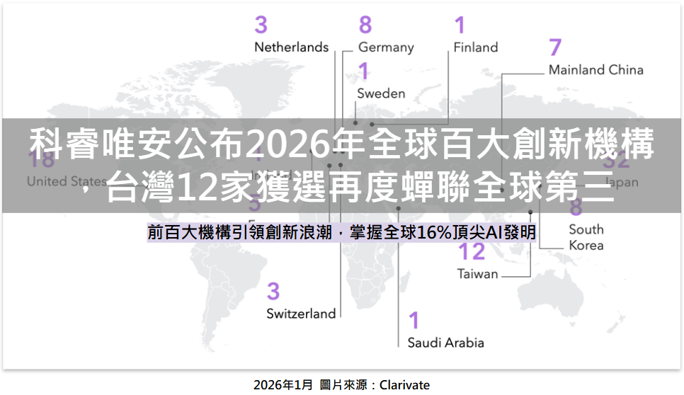 圖、科睿唯安公布2026年全球百大創新機構,台灣12家獲選再度蟬聯全球第三 【2026年1月21日】全球領先的變革性智慧資訊供應商科睿唯安(Clarivate,NYSE:CLVT)今日公布...More
