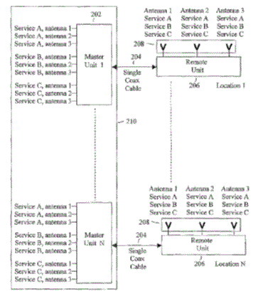 此專利主要為一方法與系統,用以傳送散佈天線系統(DAS)網路的兩個端點的不同服務間的訊號,使用一個同軸纜線傳送多重輸入輸出(MIMO) 通訊所需的訊號。初始同頻率的MIMO訊號在網路第一端點是頻率分離的。此頻率分離訊一起號透過同軸纜線傳播然後在網路第二個端點復原至初始頻率。