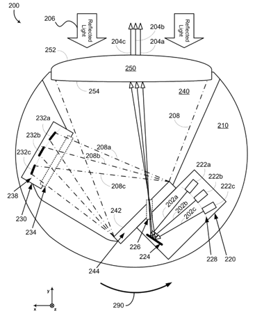 相對地,當光束204a-c與環境中已存在的物體碰觸並被反射至鏡片250時,反射光束206經由同一鏡片250之非球面表面252進入LiDar 共用空間240,所形成的聚焦光束208被投射至具有反射表面的壁面244,分散為208a-c的光線被分佈在曲面238之上的多個偵測器232a-c所接收。
