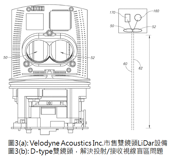 為了解決此問題,Velodyne Acoustics Inc.在其提出的US 8767190 B2專利(High Definition LiDar System,申請日: 2011/5/17)中將鏡頭形狀修正為「D-type雙鏡頭」且以背靠背左右排列的方式配置,如圖3(a)(b)所示,藉此將上述視線盲區問題加以解決。