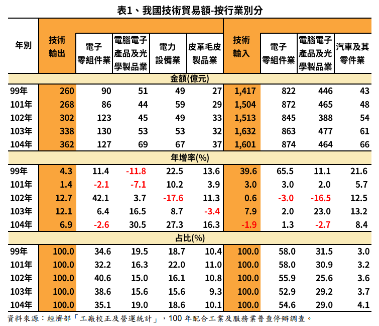 技術輸入係指上述各項所需支付之費用。我國技術輸入自99年1,417億元逐年增加至104年1,601億元。依行業別觀察,以電子零組件業874億元最多(占54.6%),主要為電子連接器及印刷電路板組件業者支付國外技術授權金較多;電腦電子產品及光學製品業464億元(占29.0%)次之,主要為支付專利使用費或智慧權利金所致。按技術輸入來源觀察,以購自美國之金額最多,達1,243億元(占77.6%);自日本技術輸入213億元(占13.3%)居次,主因液晶面板業者與日本大廠之技術專利合作,加上日系車為國內車市主力,其引擎及主要製造技術仍仰賴日本,致購自日本之液晶顯示器、汽車及零件之技術較多。