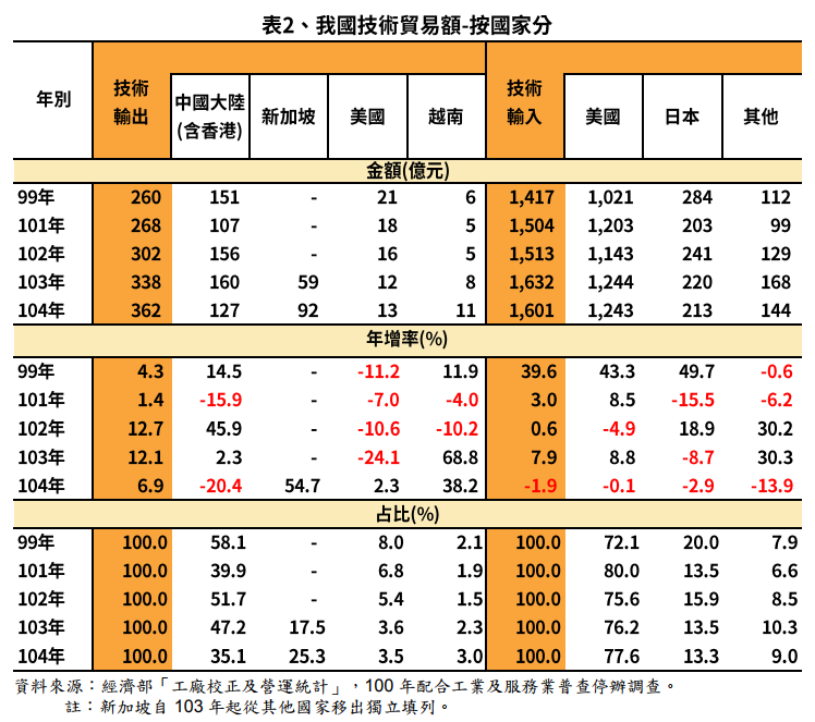 技術輸出係指權利金、授權金、技術支援、顧問費等收入。我國技術輸出金額自99年260億元逐年遞增,至104年達362億元。依行業別觀察,以電子零組件業127億元(占35.1%)居首,主因晶片設計業將其研發設計之產品技術售往海外客戶,加上液晶面板業以國內為研發中心,開發新技術及銷售技術服務予海外子公司;電腦電子產品及光學製品業技術輸出金額69億元(占19.0%)居第二,電力設備業67億元(占18.6%)居第三。按技術輸出對象觀察,以輸往中國大陸及香港127億元(占35.1%)居首,主因液晶面板業及電腦週邊設備業技術支援大陸相關業者所致;其次為新加坡92億元(占25.3%),主因電源供應器材業者銷售權利金所致;對越南技術輸出近年有明顯增加,104年達11億元(年增38.2%),主要為鋼鐵冶煉業者技術輸出給越南轉投資之公司。