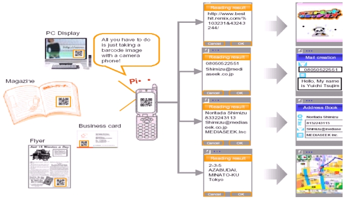 在日本國內的大街小巷之中,舉凡海報、店家資訊、網頁、護照簽證、日本鐵路局旅遊手冊都有QR Code的存在,使用者只要拿行動電話對著條碼拍照,經由行動電話內的軟體解碼後,便可以直接獲得相關資訊如網址、文字資料、圖片,可大幅節省輸入的時間,而除了文字資訊之外,圖片資訊(如地圖)也可透過此功能可直接輸入行動電話之內(圖一)。