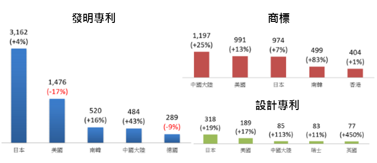 106年第3季,發明、新型、設計三種專利新申請案18,765件,較上年同期成長4%,另一方面,商標註冊申請量22,168件,亦增加12%。