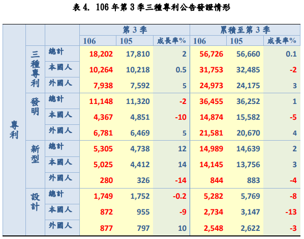 (一) 106年第3季,三種專利公告發證案18,202件,較上年同期增加2%。其中發明11,148件,設計1,749件,分別減少2%、0.2%,而新型5,305件,則增加12%(如表4)。