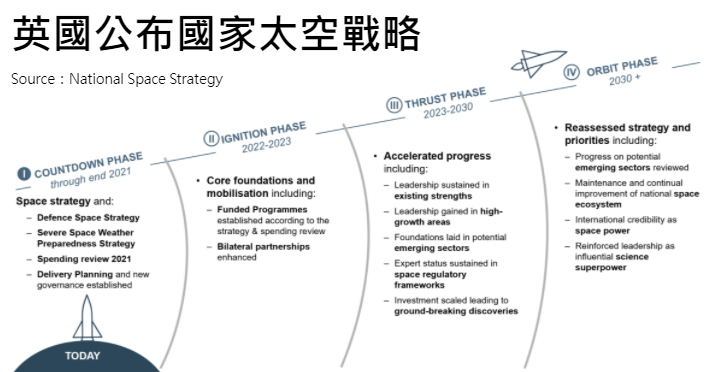英國將加入新太空經濟的全球競賽,在2021年9月27日發佈了國家太空戰略–The National Space Strategy。目前,英國太空戰略並未提政府資金的詳細內容,預計於2021年10月完成政府預算審查後,才會公布更多細節。