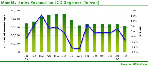 根據WitsView統計,在2005年2月台灣面板五虎營收達314億新台幣,較前一個月微幅下跌8.3%,比起去年同期下跌15.2%.出貨量達571百萬片的水準,比起1月出貨量也下滑了6.3%.
