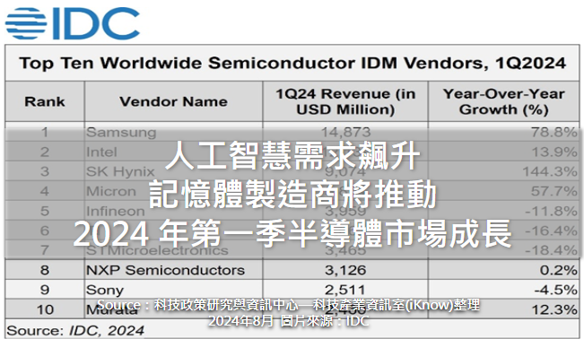 IDC最新研究「全球半導體整合元件製造市場:2024第一季前十大業者排名與分析」透露了2024 年第一季半導體產業的重要趨勢。2024年在疫情影響逐步趨緩下,終端市場回穩,加上資料中心對人工智慧訓練與推論的需求帶動記憶體提升,整體應用及庫存水準皆開始正常化,連帶帶動2024第一季整合元件製造(IDM)市場的發展,而其中高頻寬記憶體(HBM)扮演重要角色。