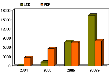根據市場研究機構DisplaySearch統計顯示,2006年第四季液晶電視在40吋至46吋等級的尺寸出貨量超越電漿電視。此外,根據南韓研究機構DisplayBank統計,2006年12月50吋以上的電漿電視面板模組出貨金額達2.33億美元,小贏40吋等級的2.32億美元。