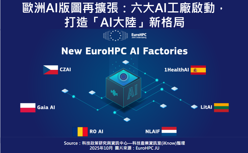 歐洲高效能運算聯合計畫(EuroHPC JU)宣布再度擴展其人工智慧基礎設施,新增六個AI工廠分別設於捷克、立陶宛、荷蘭、波蘭、羅馬尼亞與西班牙,總數達十九個。這一波擴張象徵歐盟「AI大陸(AI Continent)」戰略邁入新階段,總投資超過26億歐元,目標是建立一個能自主研發、測試與部署AI模型的數位主權體系,為歐洲產業與學術界提供強大的AI算力支撐。