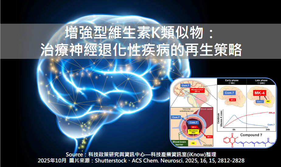 其中,維生素K是一種由萘醌環(Naphthoquinone ring)與側鏈構成的脂溶性營養素,主要參與血液凝固與骨骼代謝。近年研究顯示,其生物活性形式,甲萘醌-4(Menaquinone-4, MK-4)在腦部發育與神經保護中亦具有關鍵作用。然而,天然維生素K的神經活性仍有限,難以滿足神經退化性疾病再生治療的臨床需求。