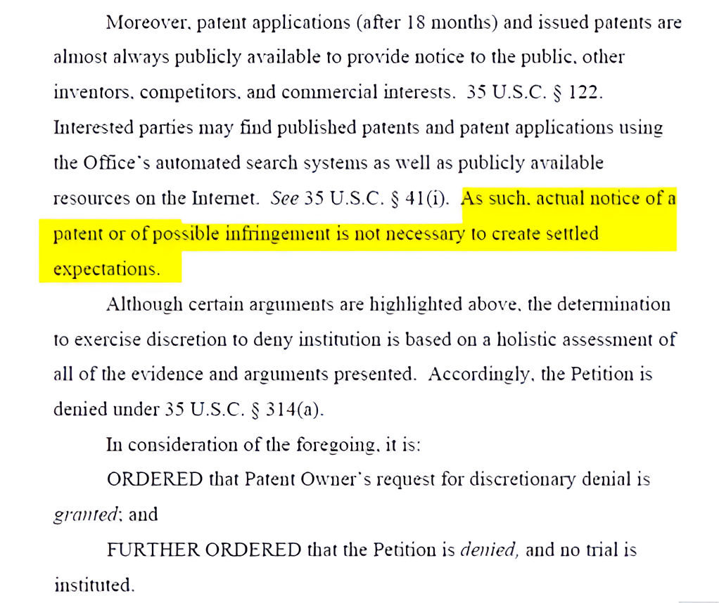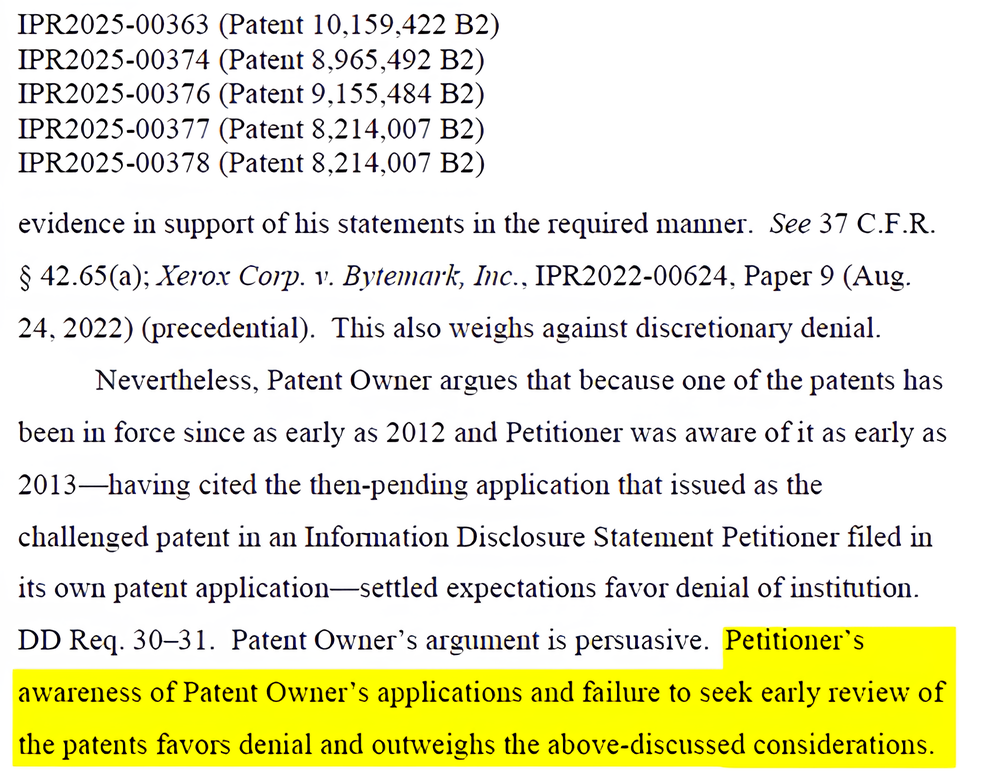 如圖1局長裁量權決定 (Director Discretionary Decision) 部分截圖所示,雖如上所述,但局長卻主張:專利權人Welch受質疑專利中的'007專利於2012年即已經核准發證,且多方複審請求人iRhythm於其US 13/890144申請案過程中,曾於2013、2015年兩次提交前案技術資訊揭露聲明 (Information Disclosure Statement, IDS),先後分別將 '007專利對應的申請公開案US20080139953A1和'007專利列為相關背景技術前案之一。如此即顯示多方複審請求人iRhythm已經知悉'007專利超過10年,但iRhythm卻未能儘早提出多方複審;如此導致相關當事人之間產生彼此間不會進行有效性質疑的"既定預期 (settled expectation)",代理局長進而據此駁回多方複審請求,拒絕立案。
