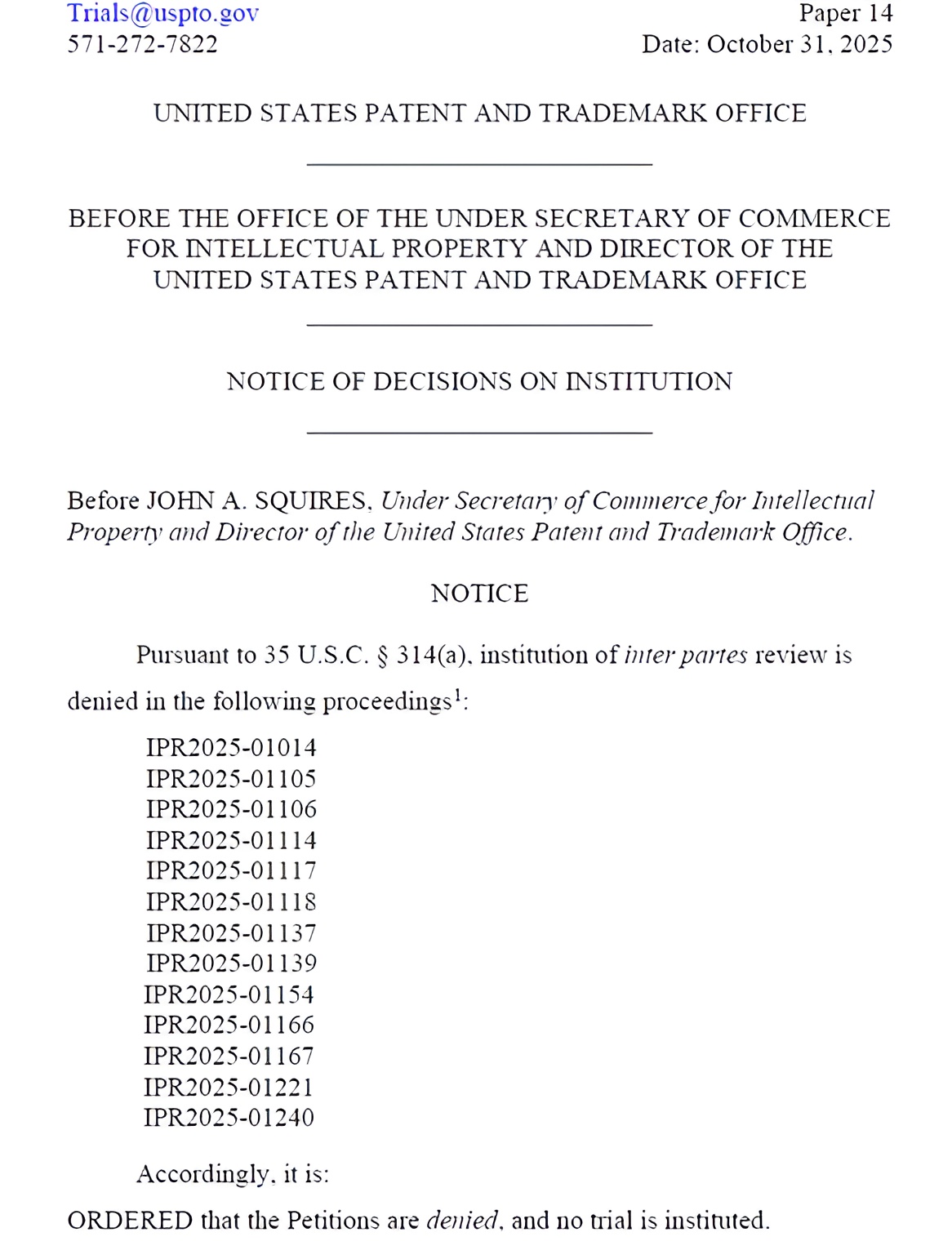 Unified Patents 2025年Q3爭議報告統計指出,如前段所描述的美國專利商標局近期運作實務,針對凡是已經核准授權超過六年的專利可造成 "既定預期",故美國專利商標局局長可依據裁量權,拒絕相關專利的多方複審立案審查;故近期多方複審請求案被駁回的件數大幅上升來到最高點。