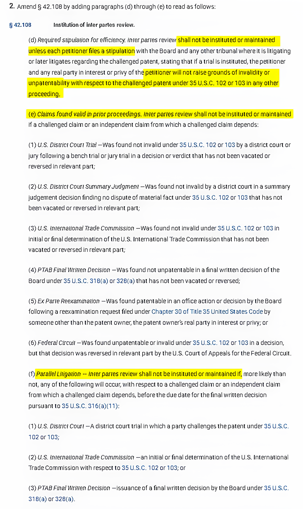 42.108(d):除非多方複審請求人承諾不在進行中或稍後進行的訴訟中,根據美國專利法第102或103條,對受質疑專利提出無效性攻擊,否則拒絕立案進行多方複審。
