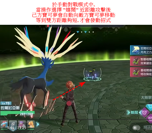 如圖2所示,當敵方寶可夢因殘血逃跑遠離, 且使用者操作寶可夢選擇 "嬉鬧" 攻擊招式時, 我方寶可夢會自動朝敵方寶可夢移動接近.