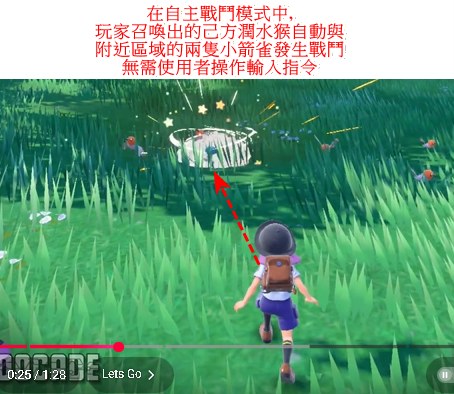 如圖3所示,玩家角色向前擲球,在面前釋放出潤水鴨後, 該潤水鴨自動與附近區域的兩隻小箭雀發生戰鬥。玩家角色只要指示移動方向,被召喚出現的潤水鴨就會與移動路線上遇到的野生寶可夢進行自動戰鬥,無需使用者操作輸入指令。