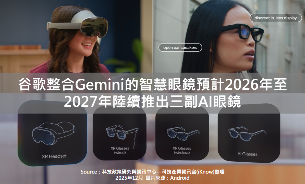 圖、谷歌整合Gemini的智慧眼鏡預計2026年至2027年陸續推出三副AI眼鏡
