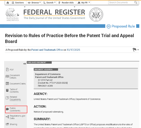 圖一、美國專利商標局擬議IPR相關條例制定公告網頁截圖