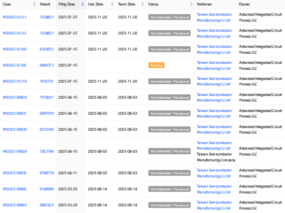 - 分別於2024年7月與9月,先進積體電路製程公司主張七項美國專利,先後對台積電和聯華電子提起專利侵權訴訟。