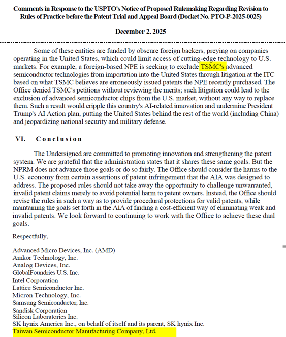 如圖四所示,台積電偕同其他11家半導體廠共同提交反對意見。尤其意見書結論前一段,還以台積電對抗先進積體電路製程公司的訴訟為例說明: "一些原告接受一些來歷不明的外國幕後支持者的資助,專門針對在美國營運的公司提起訴訟,如此可能會限制尖端技術進入美國市場。例如,一家總部位於國外的非專利實施實體(NPE)正試圖透過向美國國際貿易委員會(ITC)提起訴訟,阻止台積電(TSMC)的先進半導體技術進口到美國。台積電認為,該NPE近期購買的專利係錯誤地被核准授權。美國專利商標局在未審查相關前案證據實質內容的情況下,就駁回了台積電的多方複審申請。如此類型的訴訟可能導致先進半導體晶片被排除在美國市場之外,且沒有任何替代方案。這樣的結果將嚴重阻礙美國的AI相關創新,破壞川普總統的AI行動計劃,使美國落後於世界其他國家(包括中國),並危害國家安全和軍事防禦。" 這些半導體廠把擬議中的多方複審相關條例修改,所可能衍生的負面影響,和目前熱門的人工智慧AI晶片競爭,地緣政治加以結合。