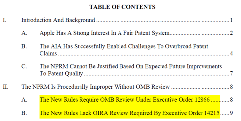 蘋果電腦主張擬議中的多方複審條例每年經濟影響超過1億美金,故目前修改程序違反行政命令