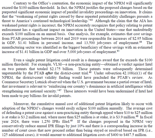 - 於2024年度,美國專利商標局共收到1250起IPR申請;若預估擬議中的多方複審相關條例會將每年的IPR申請減少10%,因此可能導致相應的法院訴訟案會增加125起 (因為這些訴訟將會繼續進行,而不會因為IPR程序暫停或免除);這將導致額外的4億至4.875億美元的年度訴訟成本 (125件訴訟x (320萬~390萬))。