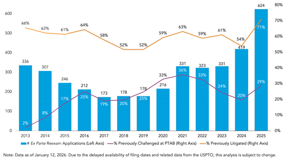 如圖一所示,該圖擷取自RPX於2026年1月發布的《Q4 in Review》報告。數據顯示,過去12年EPR申請量的年平均約為270件,惟2025年申請量躍升至624件,為過往平均值的約2.3倍,成長幅度顯著。