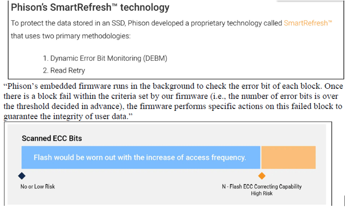 如圖二所示,針對 "控制器b)步驟:確定條目列出的位址範圍 ... 是否未能通過資料完整性測試,如果未能通過,則控制器將該條目重新對應到...下一個可用等效實體位址範圍... ",於訴狀第75~76段,Vervain將該元件對應到下列群聯電子的SmartRefresh相關的技術文件,以說明群聯被控產品會掃描記憶體的區塊錯誤位元數,當發現錯誤位元數超過閾值的較高風險區塊時,會採取措施來維持資料完整性 (圖示紅色的資料區塊D5似乎是重新對應到未用區塊S0)。