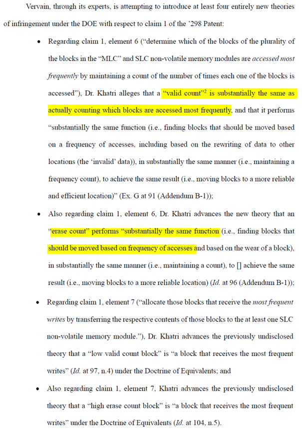 參考群聯電子提出的 "#110駁回未及時披露證據和侵權理論的訴訟動議 _MOTION to Strike UNTIMELY DISCLOSURE OF EVIDENCE AND INFRINGEMENT THEORIES" 內容,Vervain專家證人似乎企圖依據均等論 (Doctrine of Equivaent, DOE),將 ”被存取的頻率最高” 和 “寫入次數最多的區塊” 兩個元件均等對應到群聯電子產品的 “有效區塊數Valid Count” 和 “刪除次數Erase Count”。