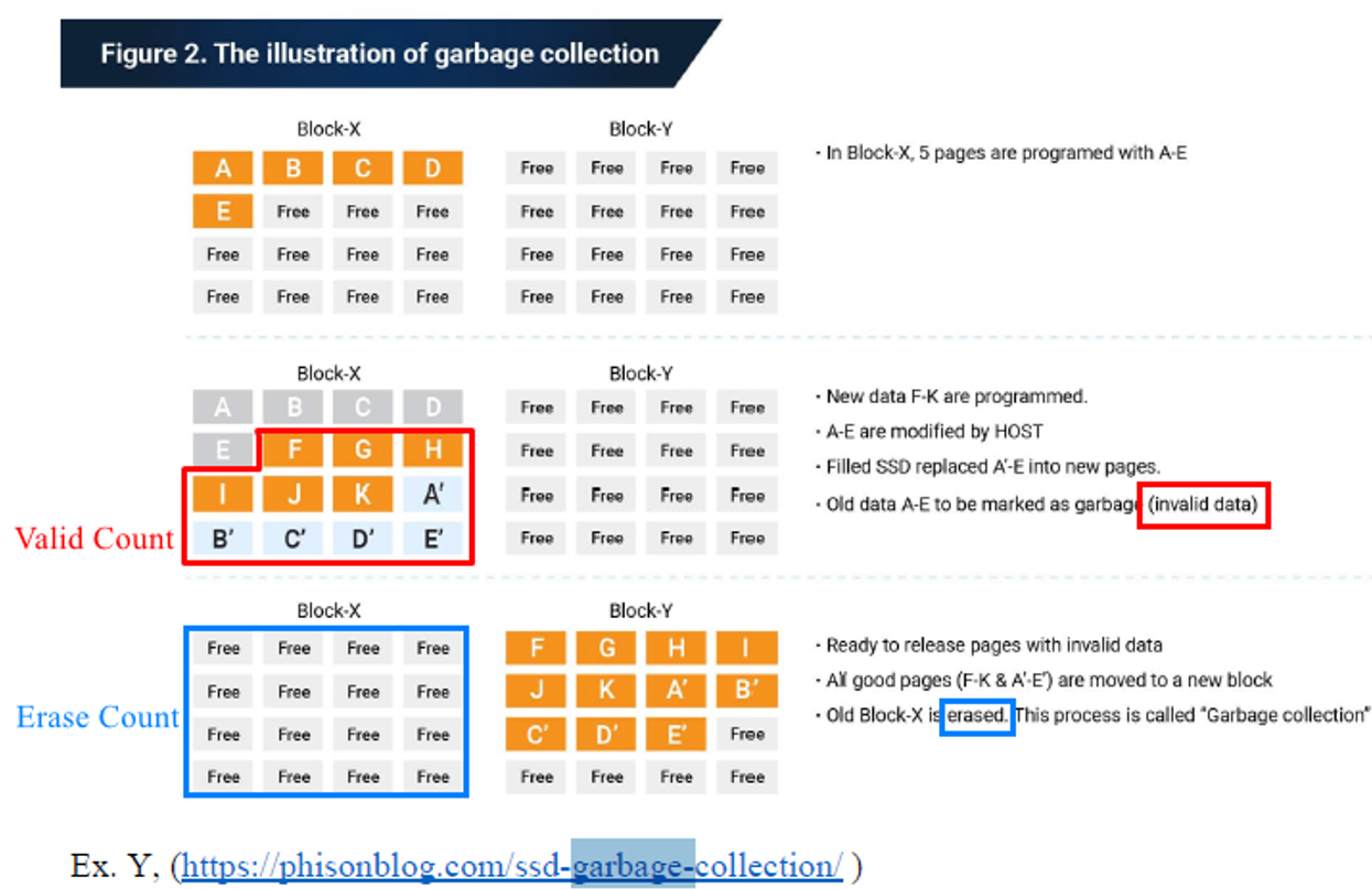 如圖三所示,於訴狀第138段,Vervain揭露群聯電子產品實施 "垃圾收集Garbage Collection" 操作的相關技術文件描述:在同一個NAND快取記憶體區塊Block-X中持續寫入/修改資料後,則該Block-X區塊可能對應產生A~E無效資料Invalid Data。為了要消除A~E無效資料占用區域,需將A’~E’, F~K等有效資料先複製搬移到Block-Y,然後將快閃記憶體Block-X整個 “區塊刪除Blocked Erased”,如此將A~E無效資料占用區域回復為可再寫入資料的可用Free記憶單元。