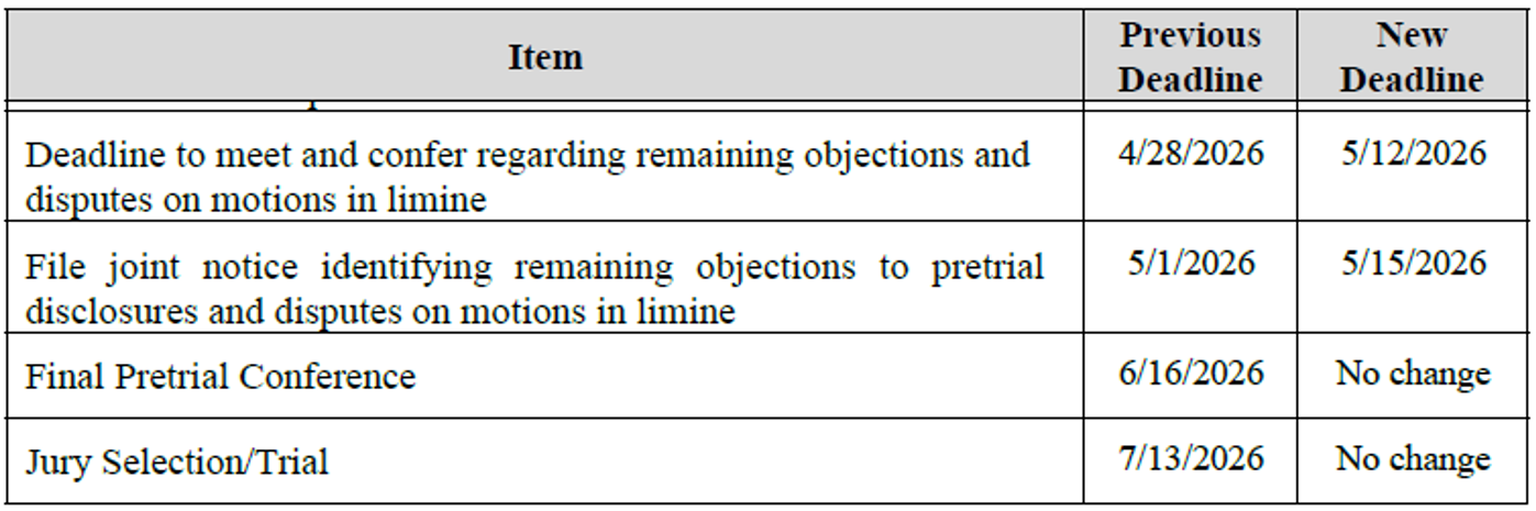 如圖四所示,原本排定2026年7月13日選擇陪審團成員後進行陪審團審判;但法院於1月26日發出修正時程命令,取消上述開庭日。依據先前程序延後約半個月,故筆者評估延遲調整後的陪審團審判日期應該不會晚於今年年底。