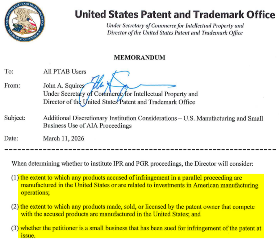 於2026年3月11日,美國專利商標局局長史奎爾斯(Squires)發布備忘錄,題為「多方複審立案的額外可裁量考量因素 - 美國製造和小型企業對AIA程序的使用(Additional Discretionary Institution Considerations - U.S. Manufacturing and Small Business Use of AIA Proceedings)」。針對是否要立案啟動多方複審(IPR)和授權後複審(PGR)程序,史奎爾斯局長新增與美國製造以及小型企業相關的三個考慮因素,該備忘錄適用於所有 "(於3月11日)專利權人提交裁量權陳述書的截止日尚未過期(due date for a patent owner discretionary brief has not yet elapsed)" 的審查中IPR和PGR案件。