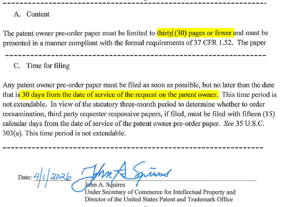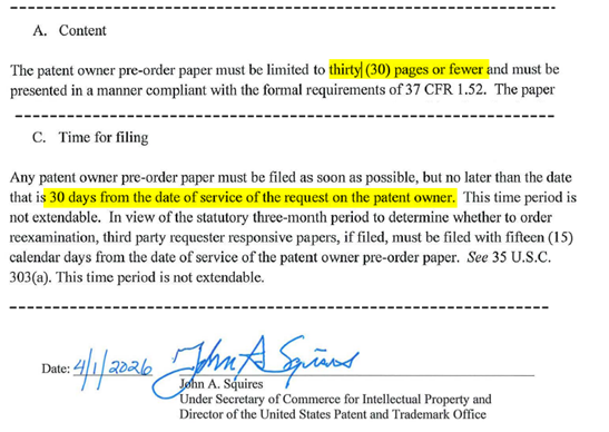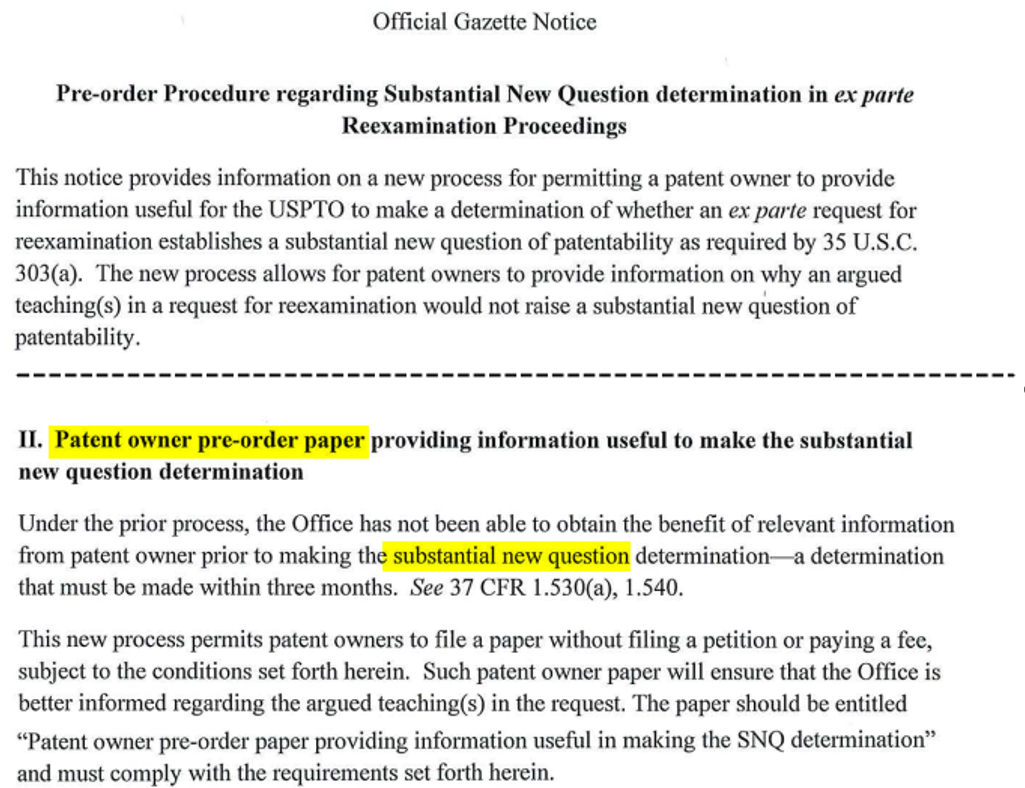 Pre-order Procedure regarding Substantial New Question determination in ex parte Reexamination Proceedings, Apr.1, 2026, Official Gazette Notice.