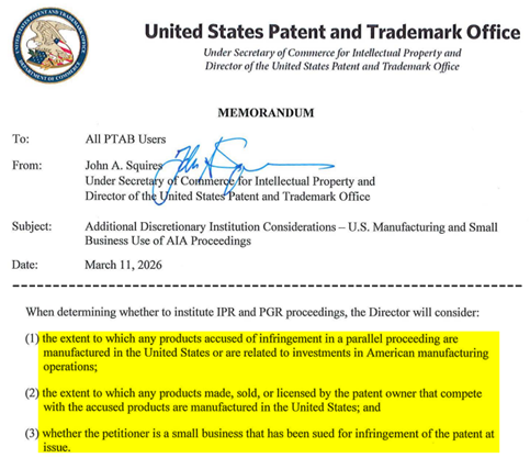 New USPTO Memorandum Adds Domestic Manufacturing and Small Business Factors to PTAB Institution Analysis, Mar.17, 2026, Crowell & Moring LLP.