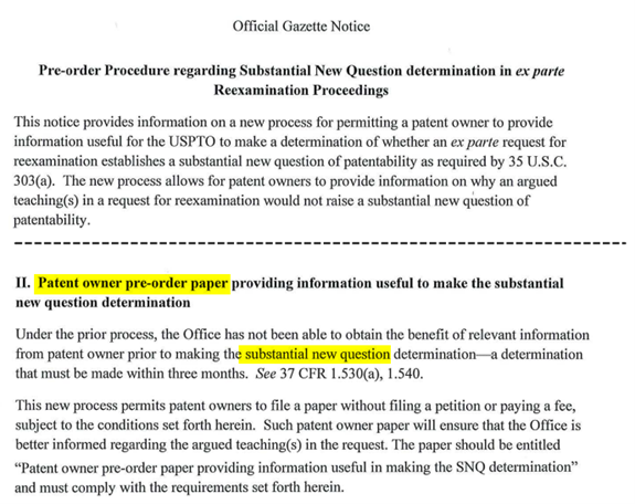 如圖2所示官方公報部分截圖,當專利權人收到單方複審請求日起算30天內、且此期限為不可延展的,專利權人可以免付規費地提交一份頁數為30頁以內的「專利權人預審文件」,以提供有助於判斷 "實質上新的專利有效性問題"(SNQ)是否存在的資訊。而當有上述「專利權人預審文件」提出時,提出單方複審之第三方請求人亦可於收到「預審文件」之日起算15天內、且此期限亦為不可延展的,來提出一份「第三方請求人答辯文件」(third party requester responsive papers),以利美國專利商標局來決定是否對此單方複審加以進行審查。