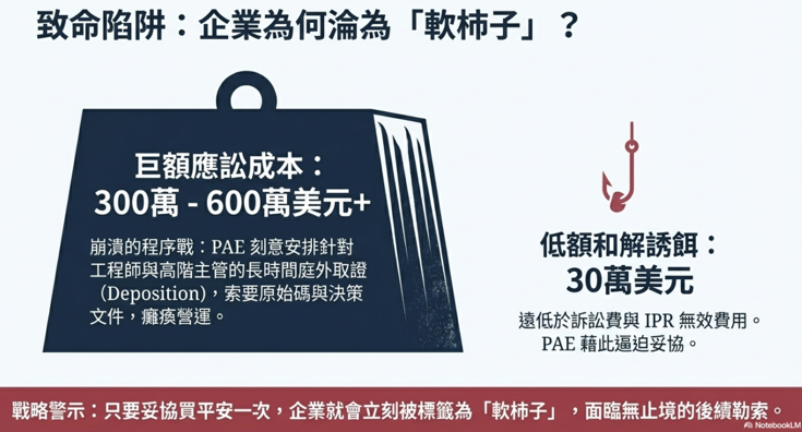 其中,deposition尤其令人頭痛,PAE常對企業員工(含工程師、專案經理、業務/財務主管、甚至高階營運主管到CEO)安排多場長時間的口供筆錄,質疑、要求確認及/或補充已揭露的大量資訊,其中包含技術規格、設計/電路圖、原始碼、行銷、財務與內部決策文件,甚至包含內部簡報、會議記錄與電子郵件備份等,造成企業在準備、律師與口譯人員陪同、差旅與時間成本上承受巨大壓力。在此種程序戰的消耗下,企業常在尚未真正討論案件實體前,就因高昂成本與風險被迫進行快速、高額且原本不必要的和解。