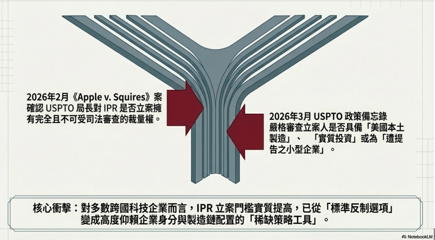 而IPR雖仍是對付PAE的有效策略之一,但近年USPTO對IPR立案標準日益嚴格,使得IPR的使用需要更加審慎與全盤的策略性考量。請參本刊盤點美國AIA法案以來IPR之立案與裁量變化 — 從PTAB專利案例法演進談起(上) & 談我國業者之因應對策(下),並參閱CAFC於2026年2月13日作出的Apple v. Squires 2024-1864號判決[12],其明白確認USPTO局長對IPR立案具有完全裁量權,以及前述USPTO局長之「裁量權備忘錄」,直指許多高頻IPR提案人,實際上並未在美國從事大量製造活動或投資,這使得IPR制度是否反而成為未深度投入美國經濟體系之大型企業的戰術工具,成為政策層級的疑慮。