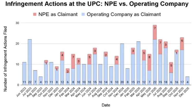 PAE近幾年因種種有利因素下又更活躍,如圖一所示,該圖擷取自RPX於 2026年1月發布的《Q4 in Review》報告。數據顯示,過去三年NPE(其中主要由PAE所驅動)在美國提起的專利侵權訴訟數量呈明顯成長趨勢。此外,圖二摘錄自 Unified Patents 同月發布的《Patent Dispute Report: 2025 in Review》報告,顯示NPE在歐洲統一專利法院(The Unified Patent Court,下稱 UPC)自2023年成立以來的提告情形:2023年為2件、2024年增至30件,並於2025年進一步攀升至45件。